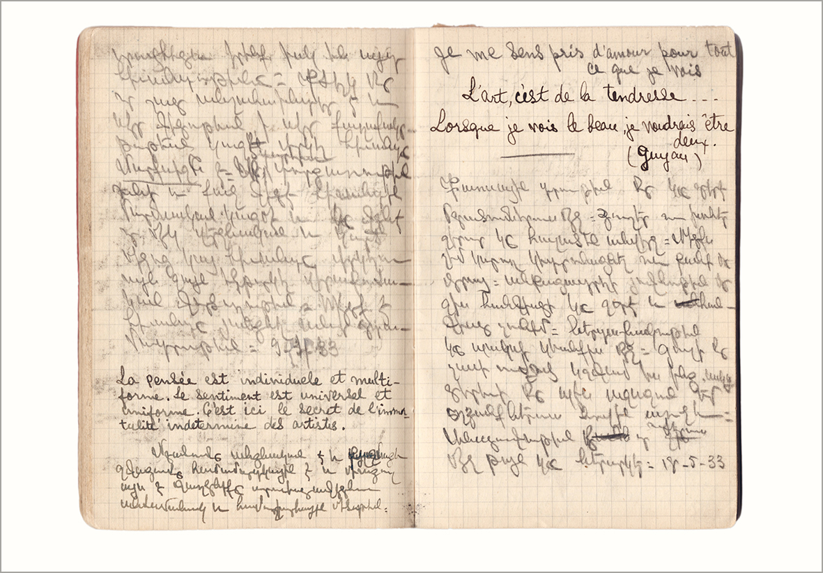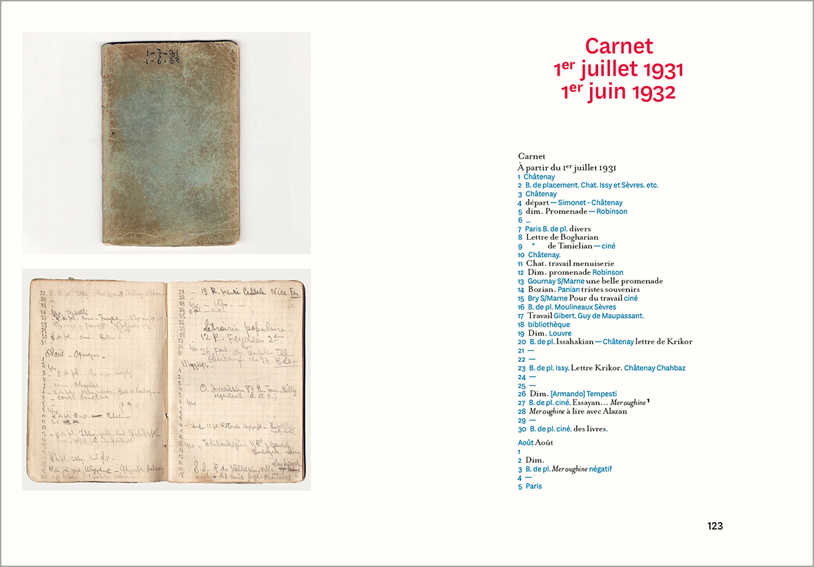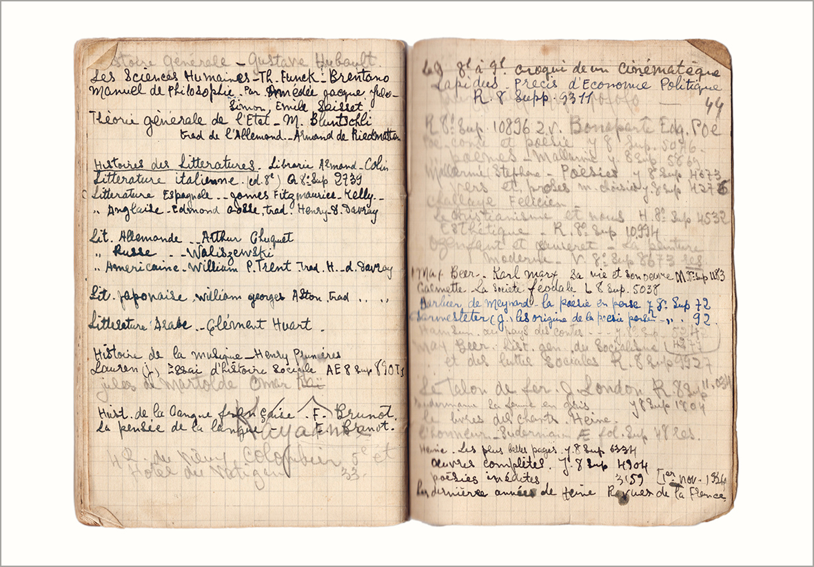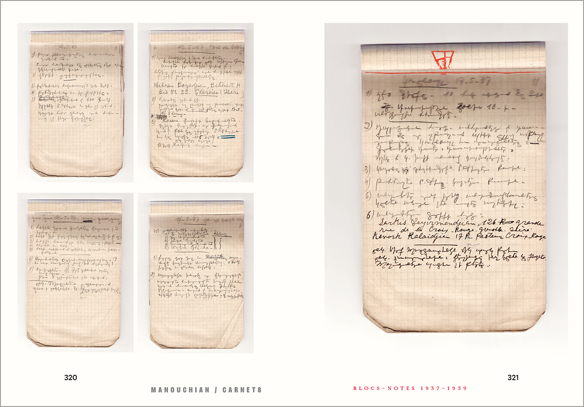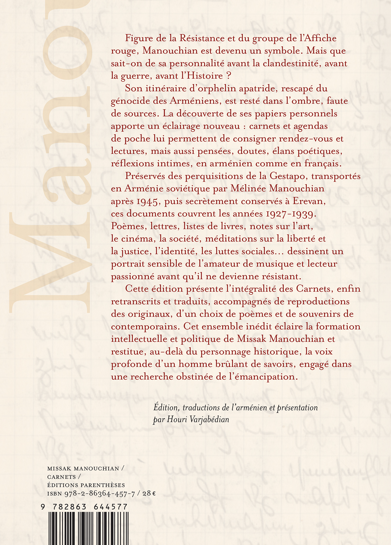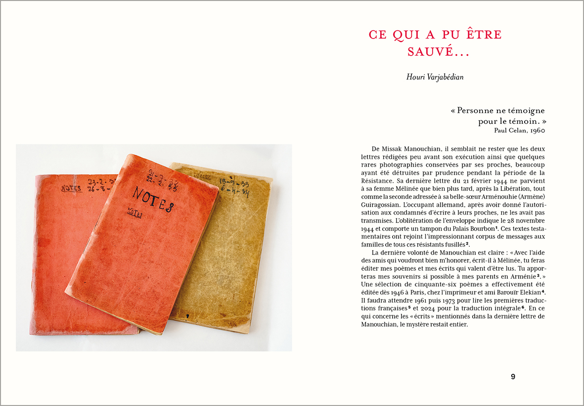 Préservés des perquisitions de la Gestapo, transportés en Arménie soviétique par Mélinée Manouchian après 1945, puis longtemps secrètement conservés à Erevan, ces documents couvrent les années 1927-1939. Poèmes, lettres, listes de livres, notes sur l’art, la musique, la société, méditations sur la liberté et la justice, l’identité, les luttes sociales : ils dessinent un portrait sensible du lecteur passionné de Romain Rolland, Hugo, Baudelaire, Wilde… avant qu’il ne devienne résistant.
