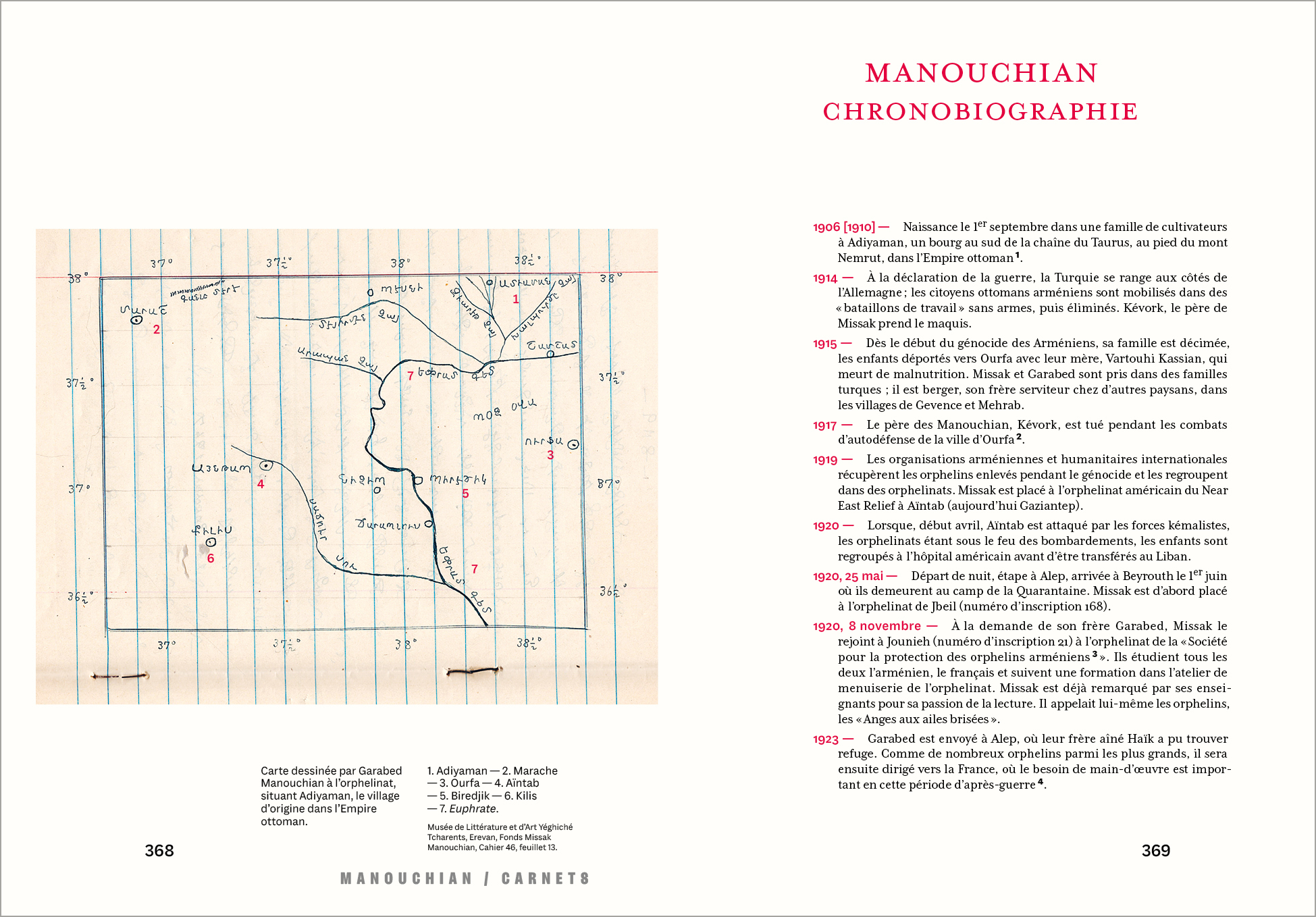 L’itinéraire de l’orphelin apatride, rescapé du génocide des Arméniens, était resté dans l’ombre, faute de sources. La découverte et l’exploration exhaustive de ses papiers personnels apportent un éclairage sur une personnalité méconnue. Dès l’adolescence au sein des orphelinats de Beyrouth, Manouchian n’a cessé d’écrire. Dans ses carnets et agendas de poche, il consigne rendez‑vous et lectures, mais aussi pensées, doutes, élans poétiques, réflexions intimes, en arménien comme en français.