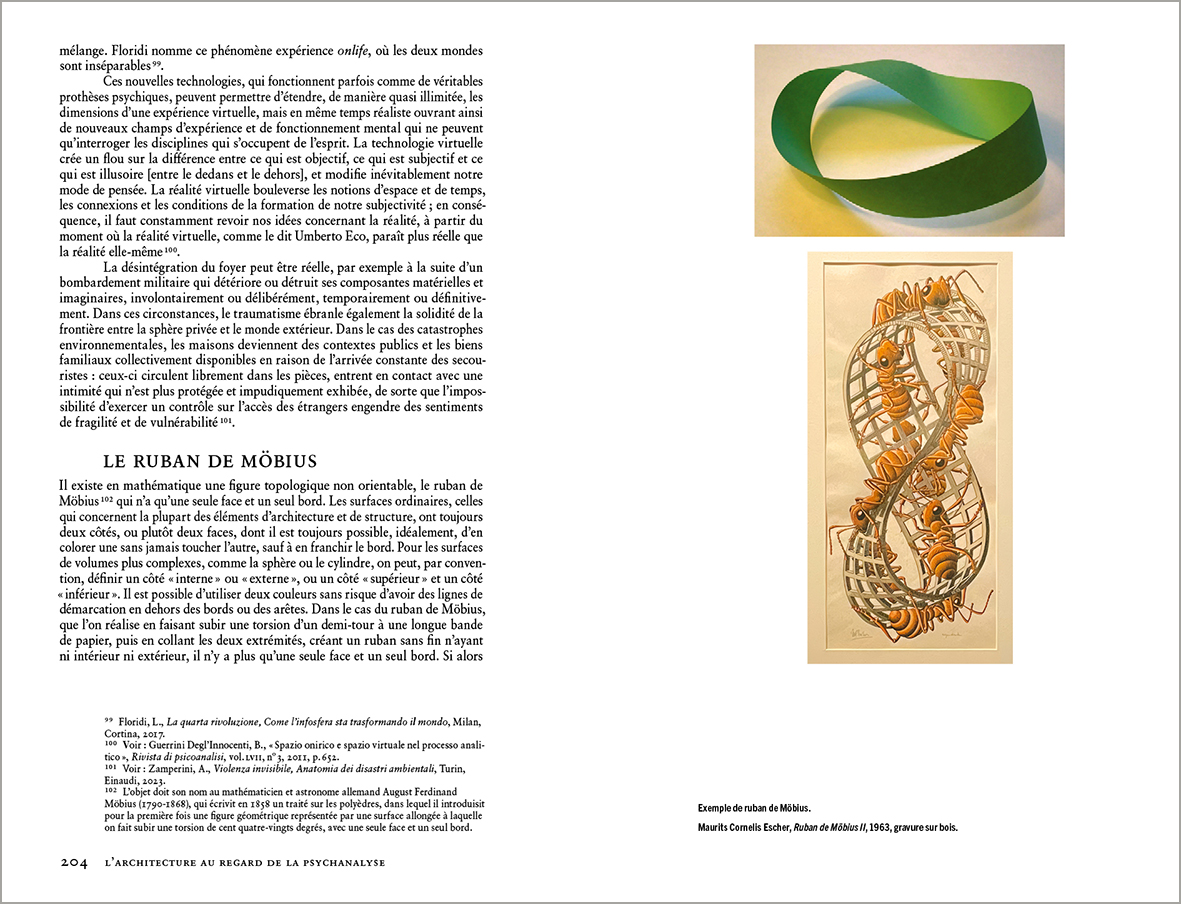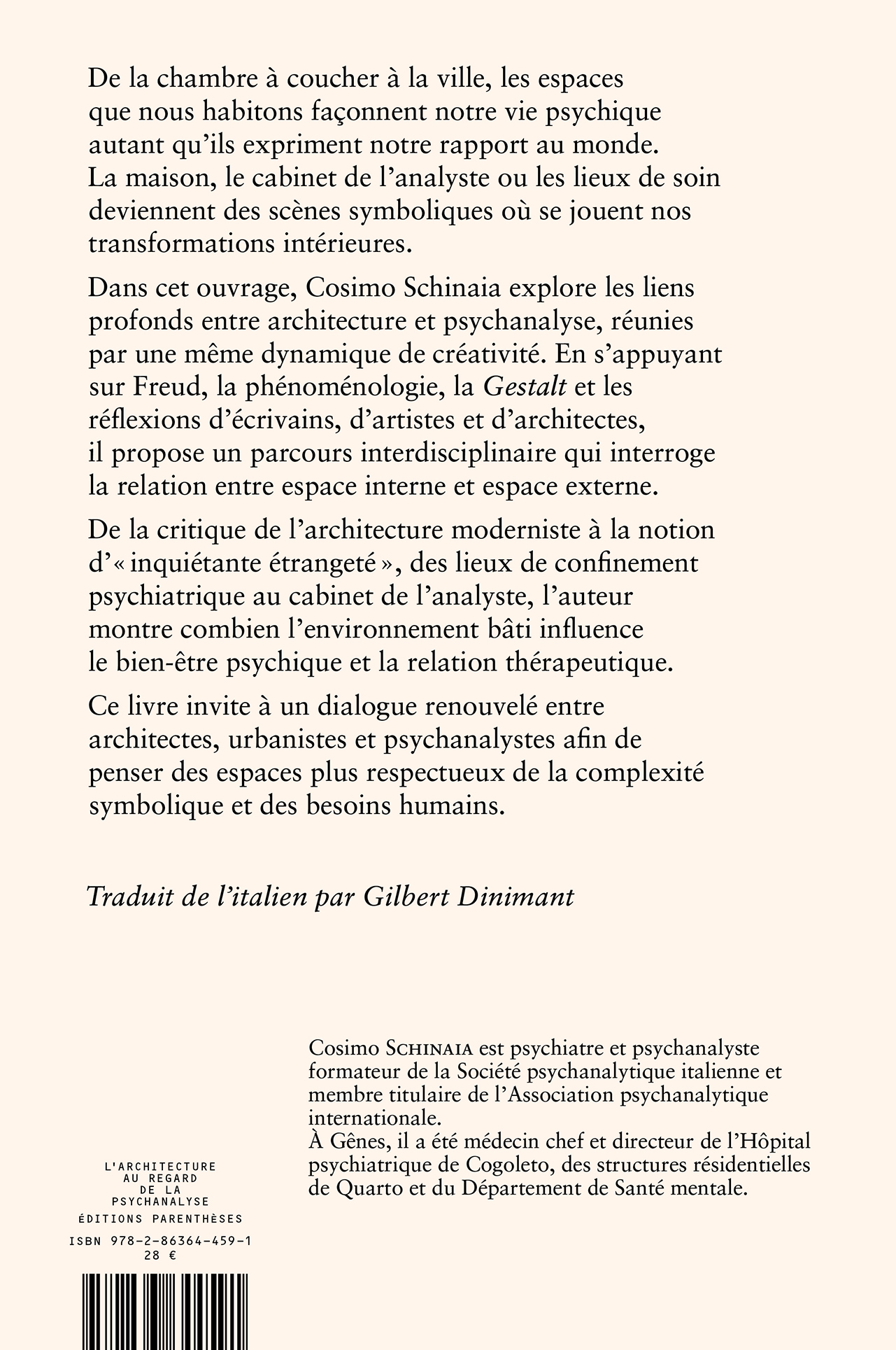 Dans cet ouvrage, Cosimo Schinaia explore les liens profonds entre architecture et psychanalyse, réunies par une même dynamique de créativité. En s’appuyant sur Freud, la phénoménologie, la Gestalt et les réflexions d’écrivains, d’artistes et d’architectes, il propose un parcours interdisciplinaire qui interroge la relation entre espace interne et espace externe.