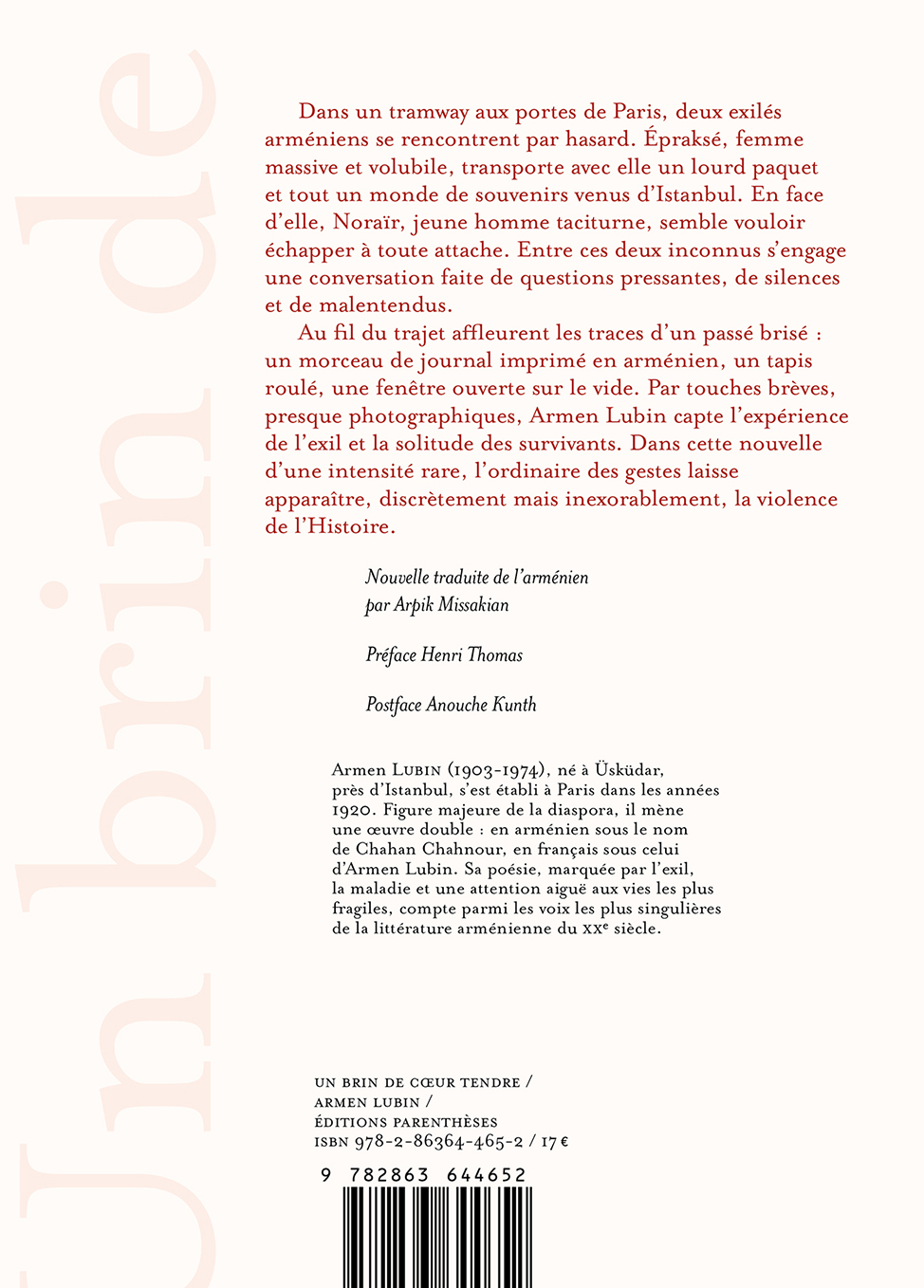Au fil du trajet affleurent les traces d’un passé brisé : un morceau de journal imprimé en arménien, un tapis roulé, une fenêtre ouverte sur le vide. Par touches brèves, presque photographiques, Armen Lubin capte l’expérience de l’exil et la solitude des survivants. Dans cette nouvelle d’une intensité rare, l’ordinaire des gestes laisse apparaître, discrètement mais inexorablement, la violence de l’Histoire.