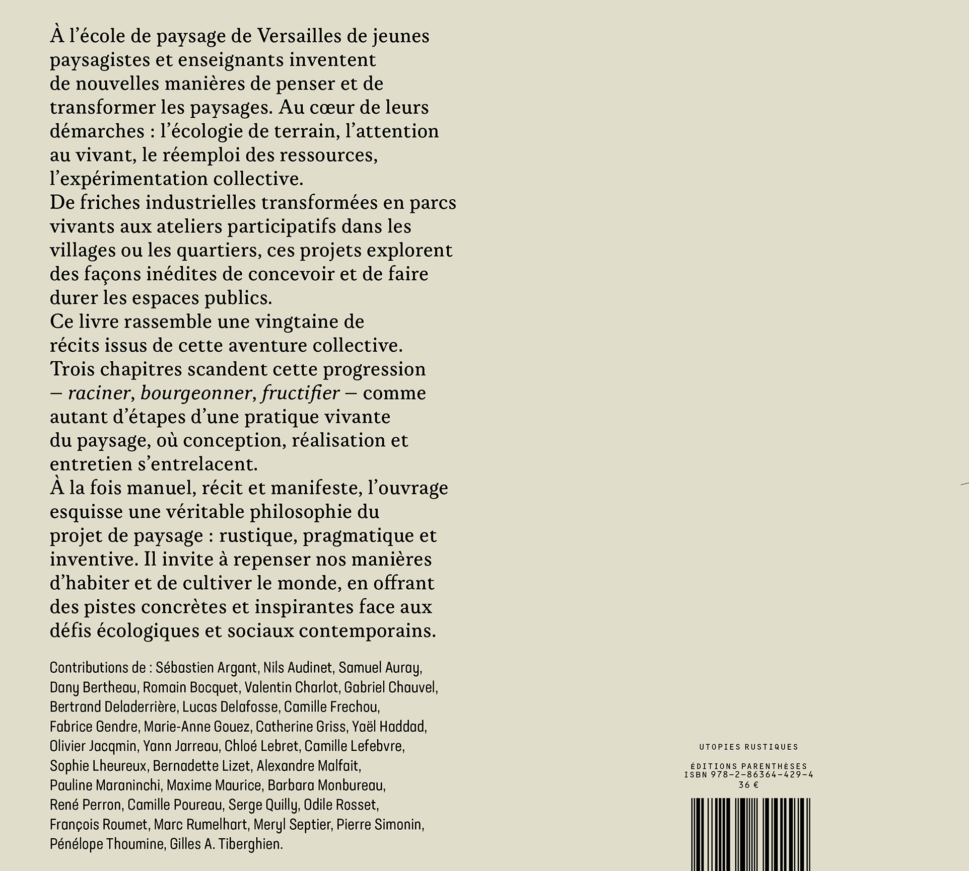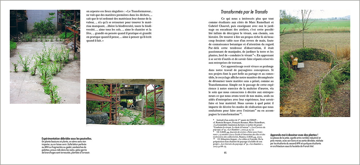 À partir des années 1980, à l’école de paysage de Versailles (ENSP), de nouvelles manières d’imaginer et transformer les paysages s’élaborent, accordant une place majeure à l’écologie de terrain dans l’aménagement des espaces publics urbains et ruraux. Des ateliers pédagogiques mettent le vivant au centre des préoccupations en cultivant l’économie des moyens matériels, le réemploi des déchets comme ressources, les vertus des expériences collectives. Hors les murs, des projets professionnels prolongent ces explorations. En 2015, devant l’intérêt suscité par ces expériences, une trentaine de jeunes paysagistes et cinq enseignants du département Écologie s’engagent alors à les décrire pour les partager. Sur la base d’un travail résolument collectif, ils produisent une vingtaine de récits.