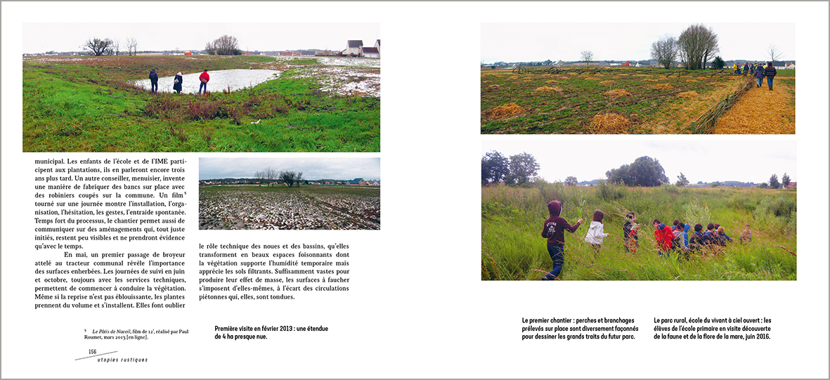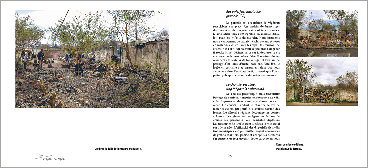 Chapitre central et pilier de l’ouvrage, « La pépinière (bourgeonner) » est le recueil de sept projets qui déploient l’éventail des expériences dans une belle diversité d’échelles et de temps d’interventions, d’une placette de village beauceron à un mont du Beaujolais en passant par l’espace collectif d’un nouveau quartier. Les axes thématiques sont variés : agriculture urbaine, médiation sociale, ré-enchantement d’espaces en perte d’âme, ateliers-résidences de concertation, accueil touristique dans une économie rurale en conversion.