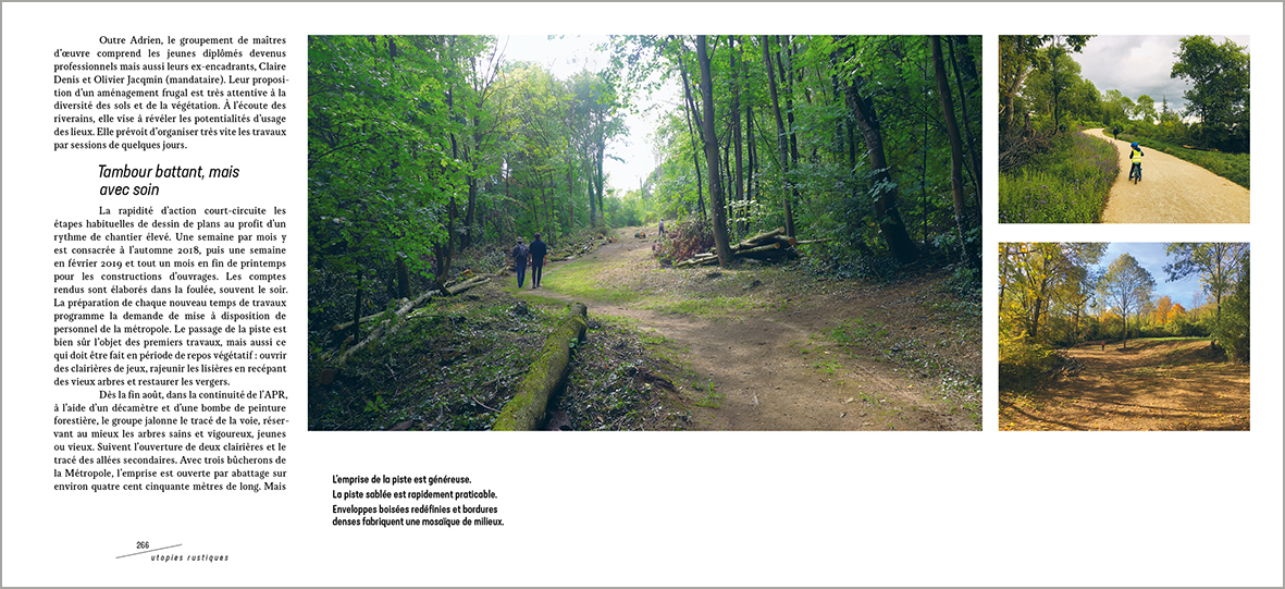 Enfin « Le verger (fructifier) » regroupe les récits de projets de maturation, certains initiés précédemment, où s’inventent des exercices originaux du métier, des méthodes et des manières de durer… en se transformant. Ces évolutions impliquent une diversité croissante de partenaires qui continuent à appeler et apprécier les interventions des professionnels du paysage.